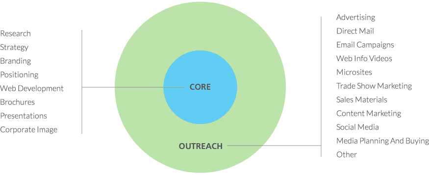 Once we develop a strategy anchored in Reality-Based insights, we deploy it in unified programs that integrate the digital and physical. We get your branding “core” right first, from your website (the hub of your brand) to sales support tools. Then we create “outreach” assets for awareness and leads.